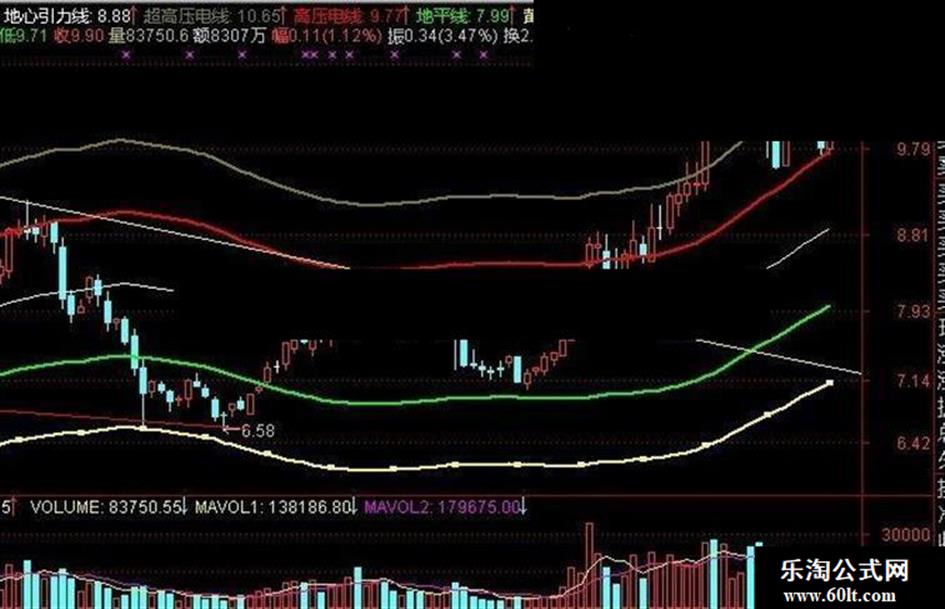 此公式为主图模式,5线之间各间隔10%。股价始终围绕地心引力线做上下波动;股价跌破地心引力线且该线下行为下降趋势;反之为上行。在一轮恐慌性跌势中,若股价跌至最底下的黄线附近为超跌,可大胆买进做多