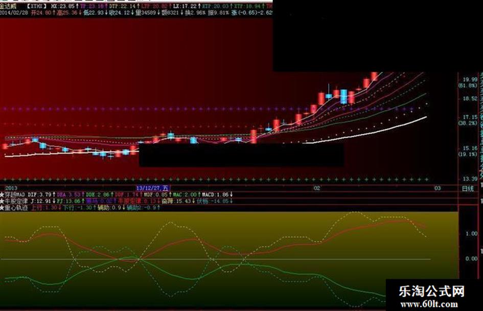 发重心轨迹指标,上下行线和两条辅助线互为参考,本指标无未来。下方贴图为飞狐,所发指标因考虑到使用通达信的朋友较多,故发通达信源码。