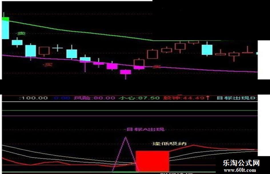 DRAWTEXT(CROSS(股海,90) AND (股神<40),75,'目标B出现'),COLORFFFF00;
