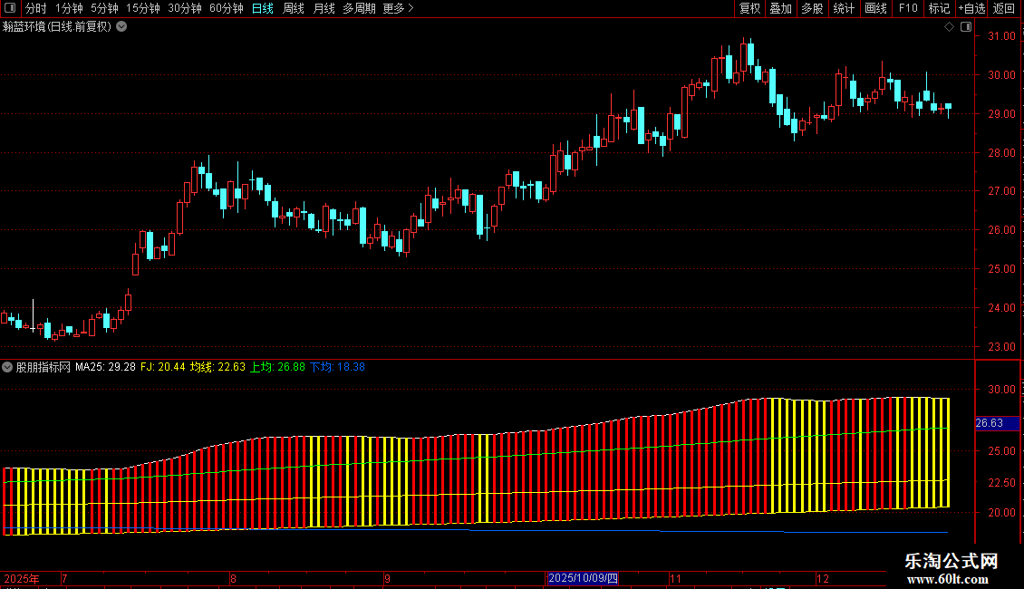 STICKLINE((MA25 <FJ)AND MA25>REF(MA25,1),MA25,FJ,1,0),COLORCYAN;