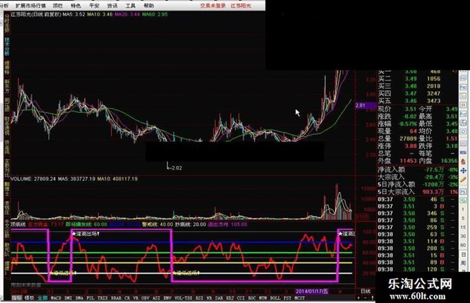 进出方向:IF((F1> REF(F1,1)),5,105),COLORMAGENTA,LINETHICK5;