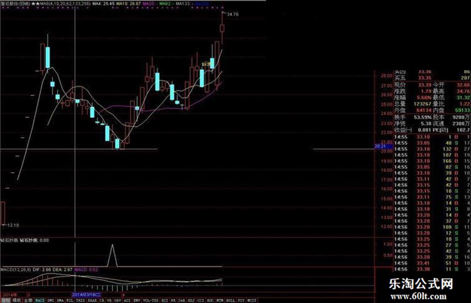AA:=MA("999999$CLOSE",1)-MA("999999$CLOSE",6);DD:=MA(CLOSE,1)-MA(CLOSE,6);A1:=DD>0;B:=AA>0;B1:=COUNT(A1,8)-COUNT(B,8);BN:=5;A2:=DD<0;C1:=B1>=4;D1:=COUNT(A2,10)=0;D2:=4*SMA((CLOSE-LLV(LOW,BN))/(HHV(HIGH,BN)-LLV(LOW,BN))*100,5,1)-3*SMA(SMA((CLOSE-LLV(LOW,BN))/(HHV(HIGH,BN)-LLV(LOW,BN))*100,5,1),3.2,1),COLORYELLOW,LINETHICK0;D3:=8;E:=CROSS(D2,D3);A:="MACD.MACD";D4:=((SMA(MAX(CLOSE - REF(CLOSE,1),0),6,1))/(SMA(ABS(CLOSE - REF(CLOSE,1)),6,1)))*(100);G:=(D4 < 25); G5:=A>REF(A,1),2 AND REF(A,2)<REF(A,3);GG1:=((CLOSE-MA(CLOSE,6))/MA(CLOSE,6)*100+(CLOSE-MA(CLOSE,24))/MA(CLOSE,24)*100+(CLOSE-MA(CLOSE,32))/MA(CLOSE,32)*100)/3;G1:=GG1<-9 AND GG1> REF(GG1,1);F:=G OR G1;G2:=SMA((CLOSE-LLV(LOW,9))/(HHV(HIGH,9)-LLV(LOW,9))*100,3,1);G6:=CAPITAL<4000000 AND C>O ;G3:=SMA(G2,3,1);G4:=3*G2-2*G3;E1:=CROSS(CLOSE,REF(EMA(DMA((((HIGH+LOW)+(CLOSE*2))/4.15),0.9),3),1))AND G4<55;钻石抄底:FILTER(C/REF(C,1)>=1.03 AND COUNT(E1,3)>=1 AND COUNT(F,6)>=1 AND COUNT(E,10)>=1 AND COUNT(REF(C1,10),25)>=4 AND COUNT(REF(D1,10),25)>=4,6) AND G6 AND G5;