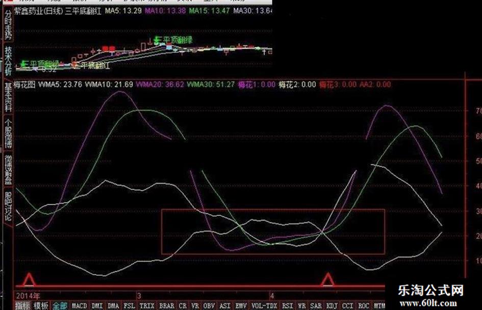 梅花1:(WMA5>=WMA10 AND WMA20>=WMA30 AND ( WMA20-WMA30<1.35 OR WMA5-WMA20<1.35) AND WMA5-WMA10<3.8 AND C>REF(C,1)*1.002 AND WMA10<REF(WMA10,1) AND WMA5<30 AND MAX(WMA20,WMA30)<35)*15,COLORFF00FF,LINETHICK3;