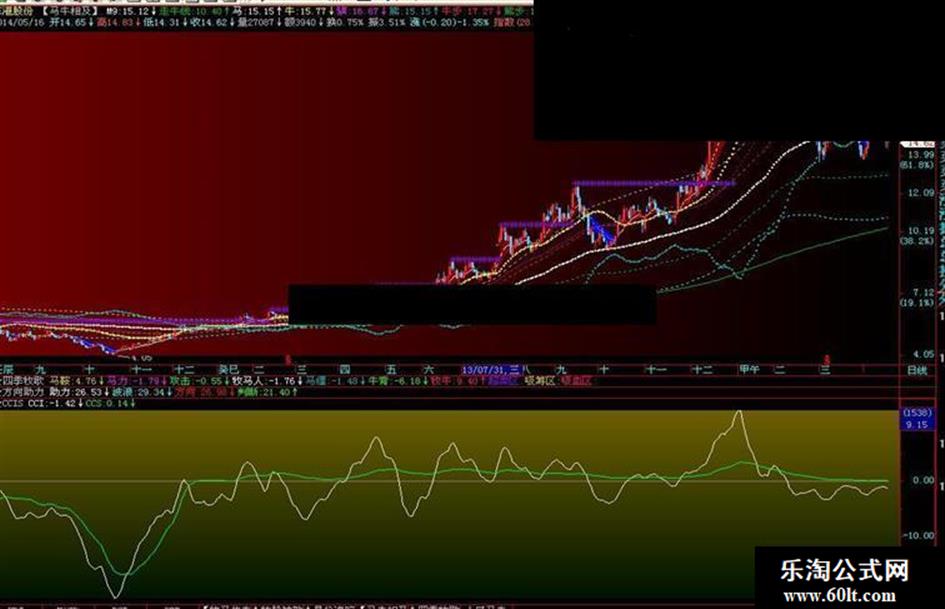 这是各个软件中的CCI指标公式。TYP是几何平均价。这个指标的关键之处在(TYP-MA(TYP,14))这里,就是几何平均价与几何平均价的14日简单平均的差值。AVEDEV为平均绝对偏差,而0.015反映的是线形的波动范围。所以说这个指标没有什么特别之处。下面借鉴这一原理改造下面贴图指标。其改造原理是按照主图的均线而编写。