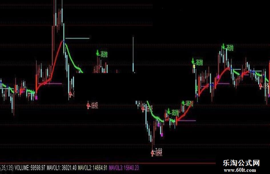 DRAWTEXT(CROSS(庄家,散户) AND 散户>70,H+0.05,'←高抛'),COLORGREEN;