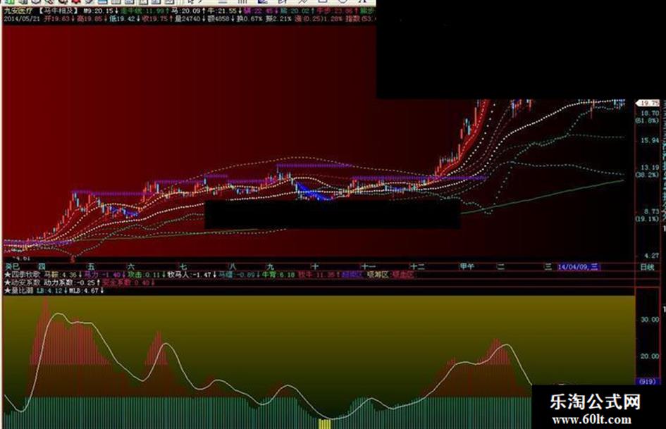 此量比潮为量比的变异指标,可以说是量比的极品指标,黄色柱线为地量量比为黄金坑,3到9之间为青色柱属于震荡行情,大于9棕色柱为可操作区域,大于18为红色柱,关注柱线与白色线的关系。
