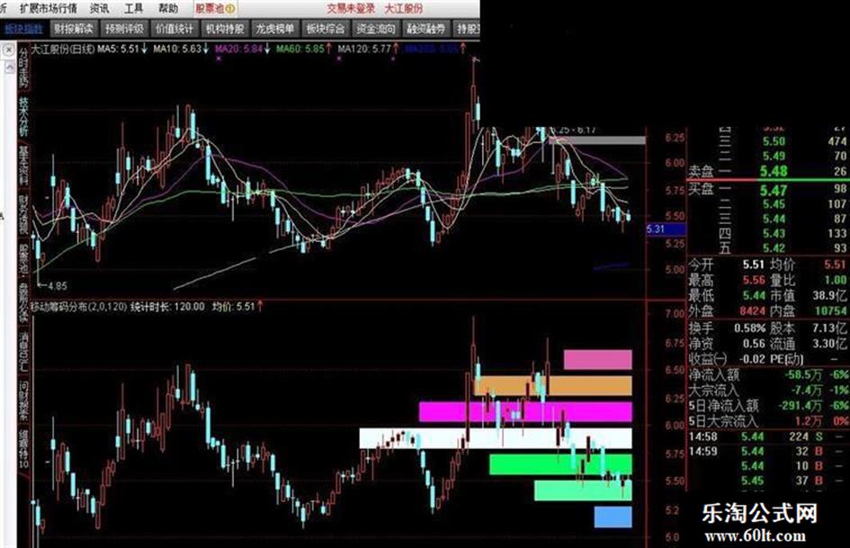 STICKLINE(CURRBARSCOUNT<CONST(INTPART(ML8*200)),L7,L8*0.99,5,0),COLORAA5DDD;ML9:=SUM((CURRBARSCOUNT<KK+1 AND RANGE(均价,L8,L9+0.001))*V,KK)/MLZ;