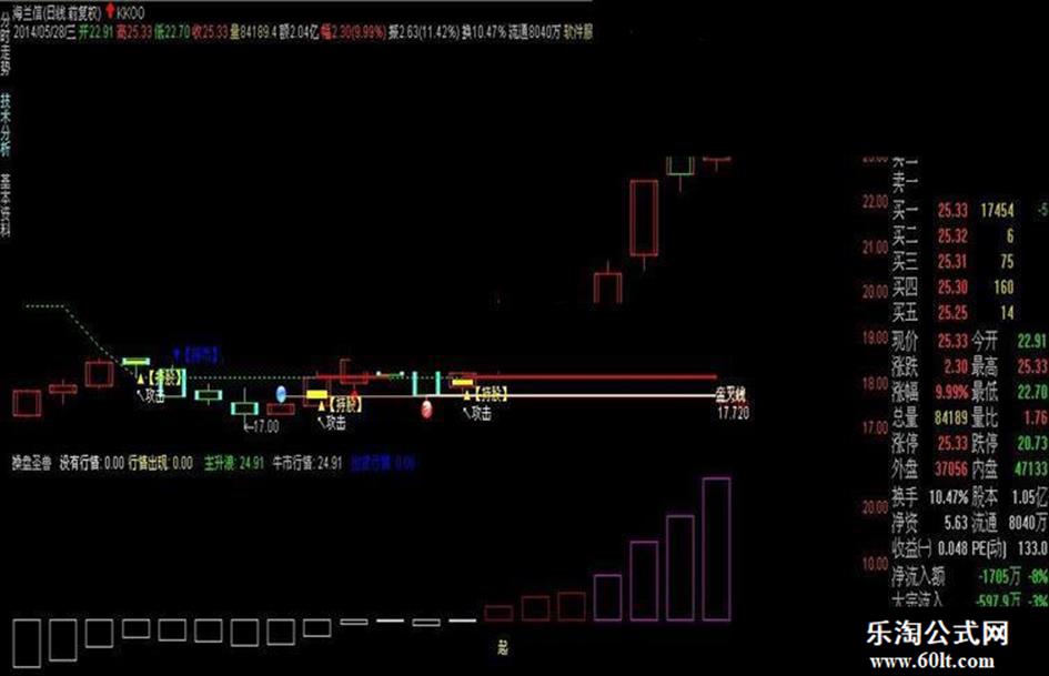 行情出现:IF(A10,5,0),LINETHICK0,COLOR00AAAA;