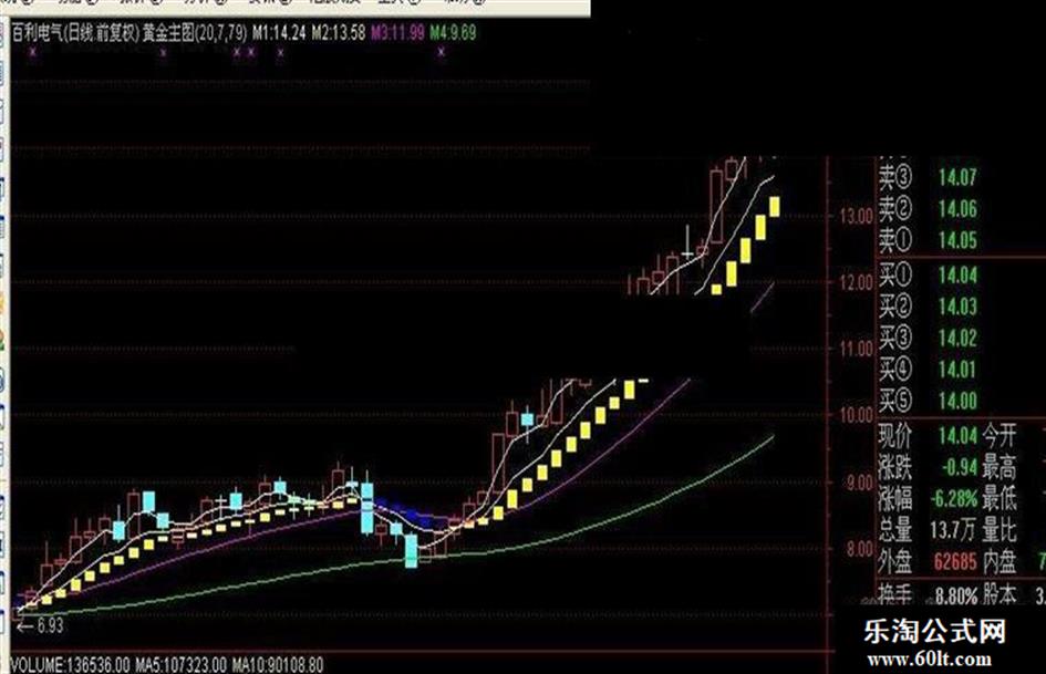 使用方法:本指标适合抓大波段,买点为出现第一个黄金柱,卖点为出现第一个蓝色柱。