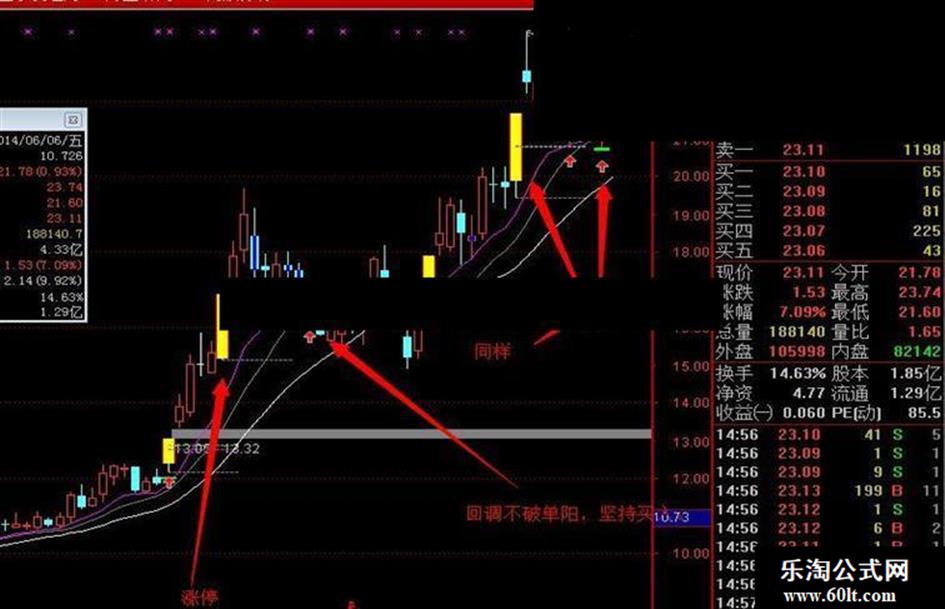 涨停回马枪,大阳涨停回调单阳不破,买入再次拉升,获利。