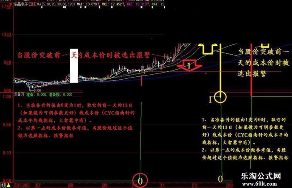 1、当准备升的值由0变为1时,取它的前一天的13日(如果做为可调参数更好)线成本价(CYC指南针的成本平均线指标,大智慧中有)。