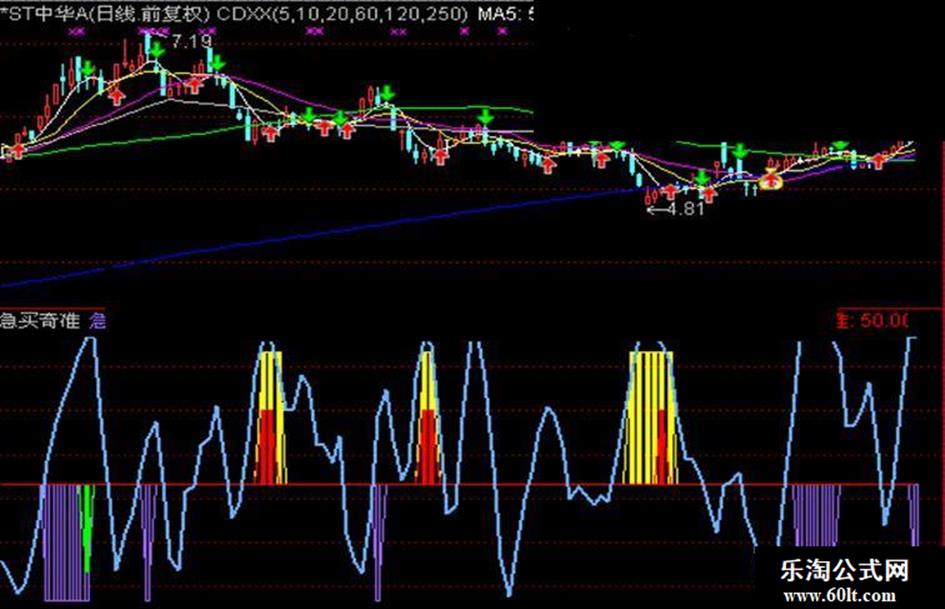 急买奇准:IF(LLV((买<买卖),5),75,50),COLORRED,LINETHICK1;