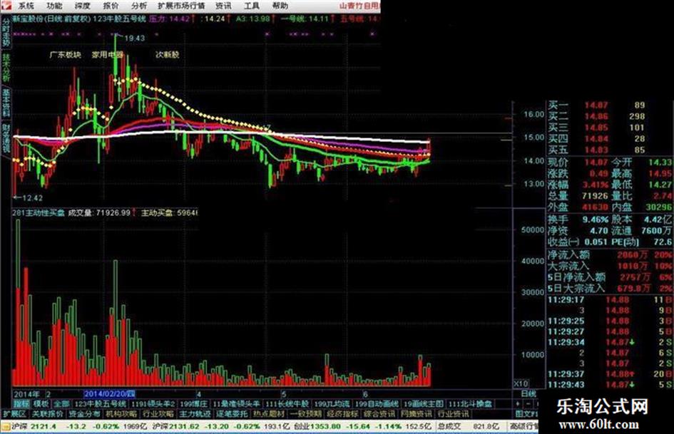 主动买盘:IF(CLOSE>OPEN,AA*(HIGH-LOW),IF(CLOSE<OPEN,AA*((HIGH-OPEN)+(CLOSE-LOW)),VOL/2)),POINTDOT,COLORYELLOW;