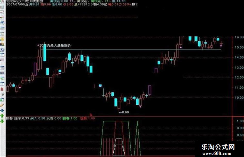 欢喜:=IF((((((((REF(CLOSE,13) - CLOSE) / REF(CLOSE,13)) * 100) > 15) AND ((SUM((VOL / CAPITAL),13) * 100) < 18)) AND (((VOL / CAPITAL) * 100) < 2.5)) AND ((((REF(CLOSE,1) - CLOSE) / REF(CLOSE,1)) * 100) < 8)),0.7,0),,COLORFFCC66;