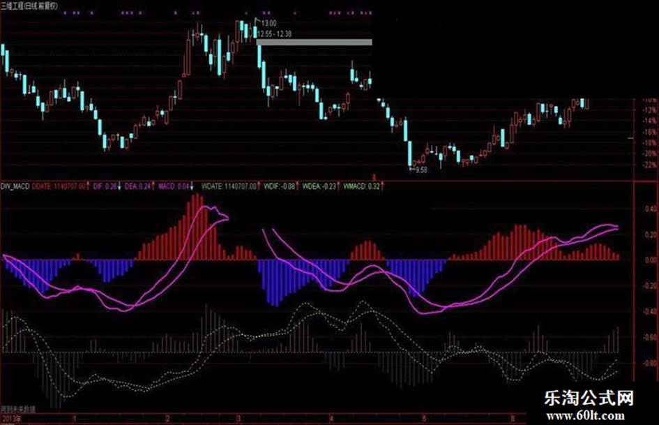 还有,你不要用纵坐标值看周线macd曲线的数值,本公式主要是为了在日线macd指标中同时观察周线MACD曲线的趋势。当然,如果你确想知道倒数第n条周K线上的周线MACD的具体数值,就把光标移到本图的第n条K线位置上,看顶行显示的后4个数据:该周日期(倒数第n周周末交易日的日期)WDate、WDif、WDea、和WMacd值。这些值是准确的、没有变换的周线macd值。