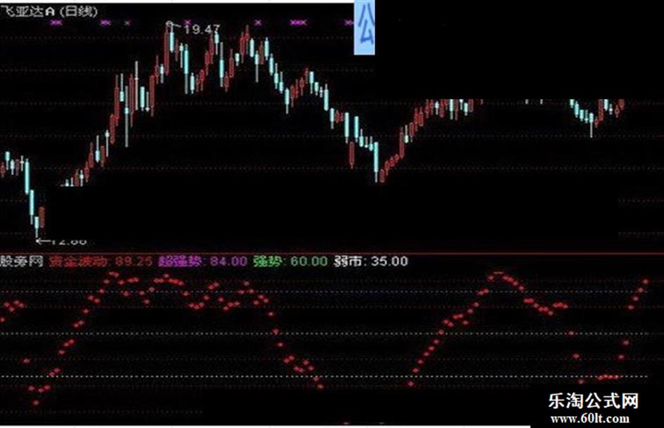 资金波动:EMA(100*(C-LLV(LOW,34))/(HHV(H,34)-LLV(LOW,34)),3),POINTDOT,COLORRED,LINETHICK4; 超强势:84,POINTDOT,COLORMAGENTA; 强势:60,POINTDOT,COLORGREEN; 弱市:35,POINTDOT,COLORWHITE;