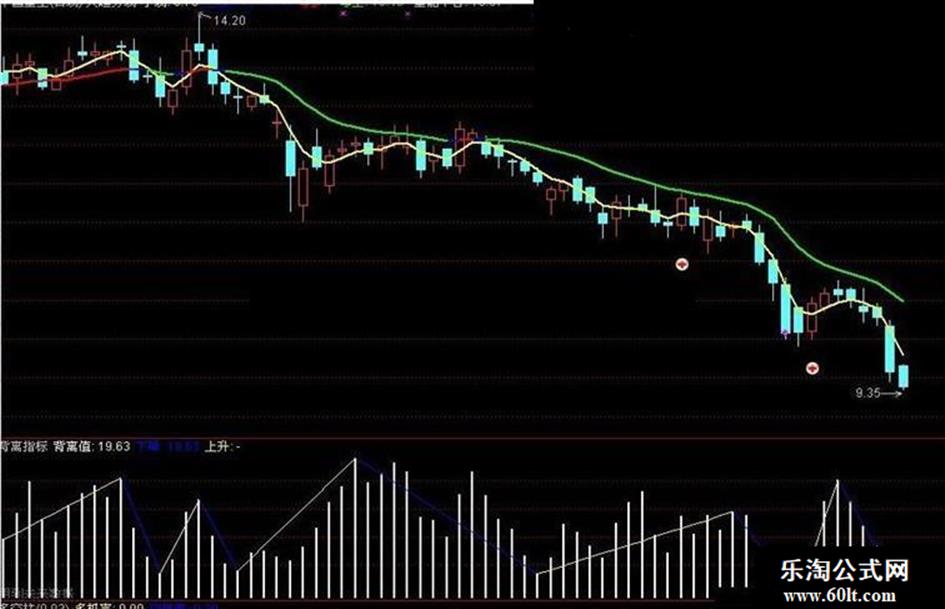 下降:DRAWLINE(背离值>=HHV(背离值,6),背离值,背离值<=LLV(背离值,6),背离值,0),COLORBLUE; 上升:DRAWLINE(背离值<=LLV(背离值,6),背离值,背离值>=HHV(背离值,6),背离值,0),COLORYELLOW;