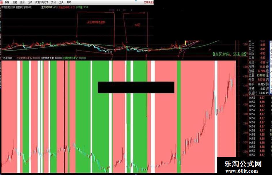 副图叫三色辨趋势,粉红色是上升持股趋势,相当于我主图的B点段,绿色代表下降趋势,相当于主图的S点段。而它多了个白色,我看了下,白色出现的位置在我的主图上,不是顶在压力线,就是回到支撑线的位置,如果继续向上或向下,就会打破主图 的B S点了,应该是非常高明的。提示我们要看好走势。