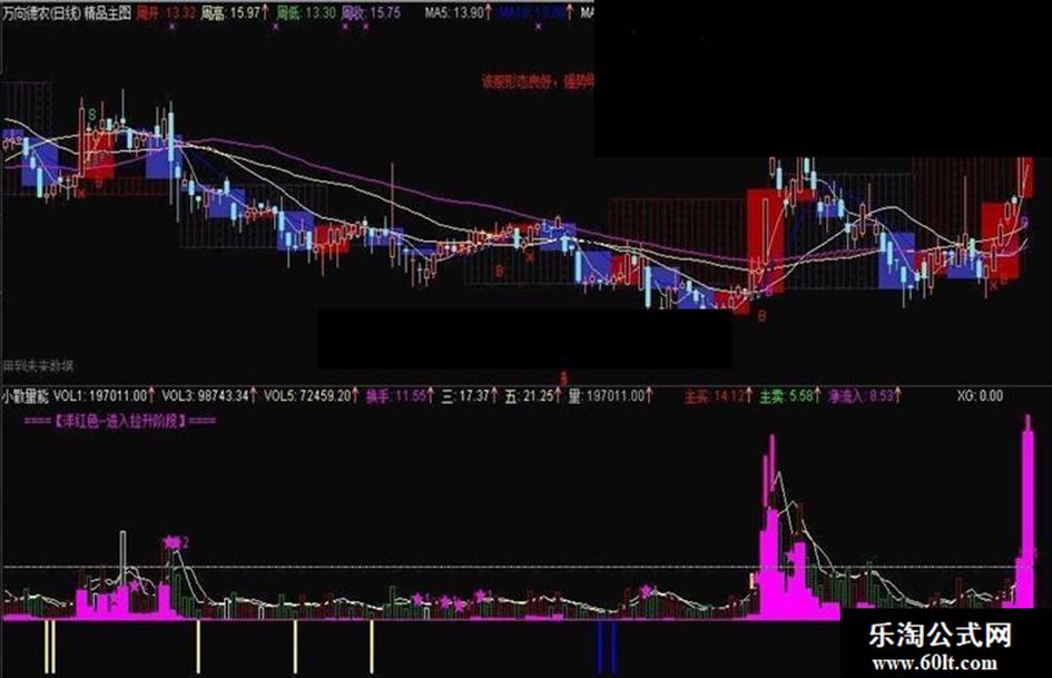 DRAWTEXT(T1=1 AND CURRBARSCOUNT=80,AAA-(AAA*0.03),'量能理想,明显走强,中线参与,仓位在2/3左右'),COLORFF00FF ;