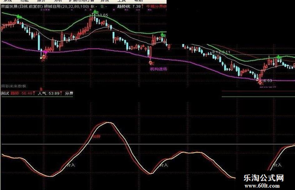 DRAWTEXT(CROSS(趋势,30) AND 人气<趋势,30,'介入'),COLORYELLOW;