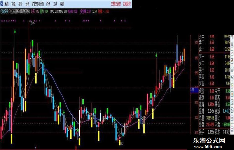 5、指标的关键在于股价在波段上升(紫红色线上)或震荡行情中回调或洗盘后出现了黄底托财神指标赢利概率较高,股价在波段下降(浅蓝色以下)出现黄底托财神指标无效,不要做。