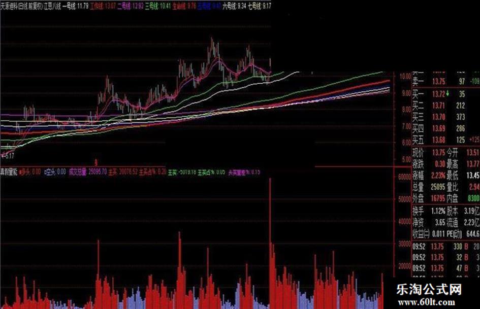 主买:IF(CLOSE>OPEN,VAR0*(HIGH-LOW),IF(CLOSE<OPEN,VAR0*((HIGH-OPEN)+(CLOSE-LOW)),VOL/2)),COLORRED,POINTDOT;
