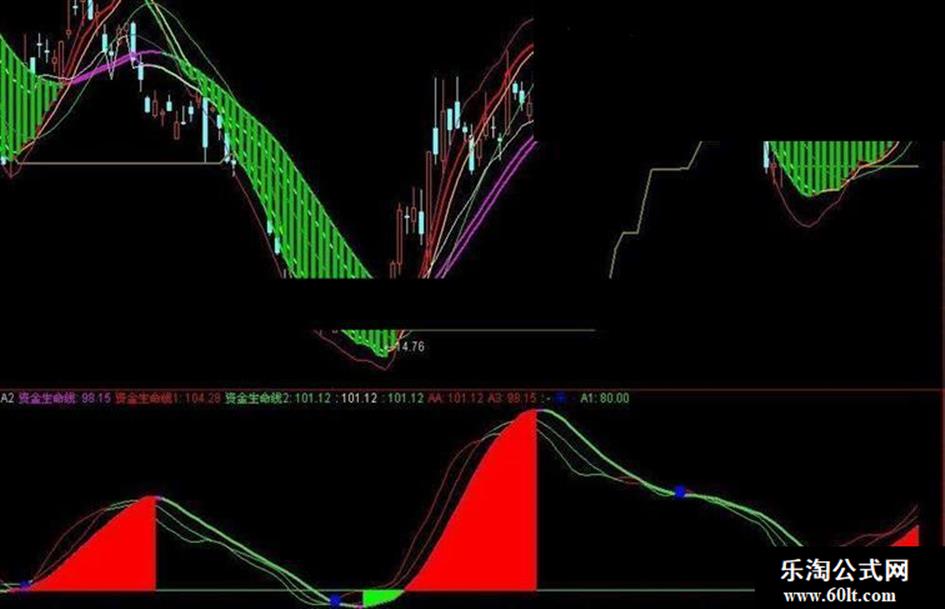A3:IF(资金生命线>=REF(资金生命线,1),资金生命线,DRAWNULL),COLORRED,LINETHICK2;