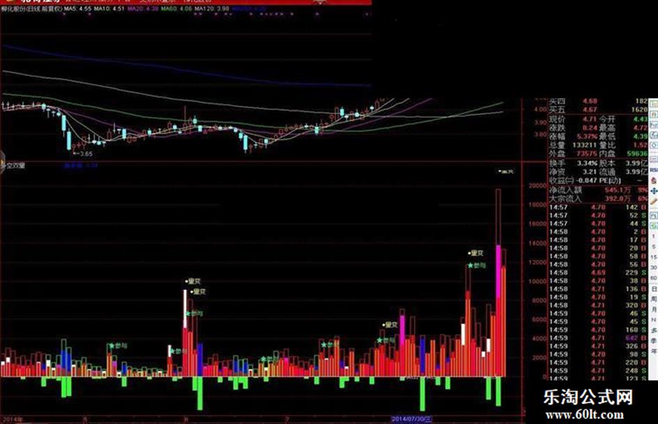 卖盘:=IF((CLOSE > OPEN),(0 - (VAR1 * ((HIGH - CLOSE) + (OPEN - LOW)))),IF((CLOSE < OPEN),(0 - (VAR1 * (HIGH - LOW))),(0 - (VOL / 2))));