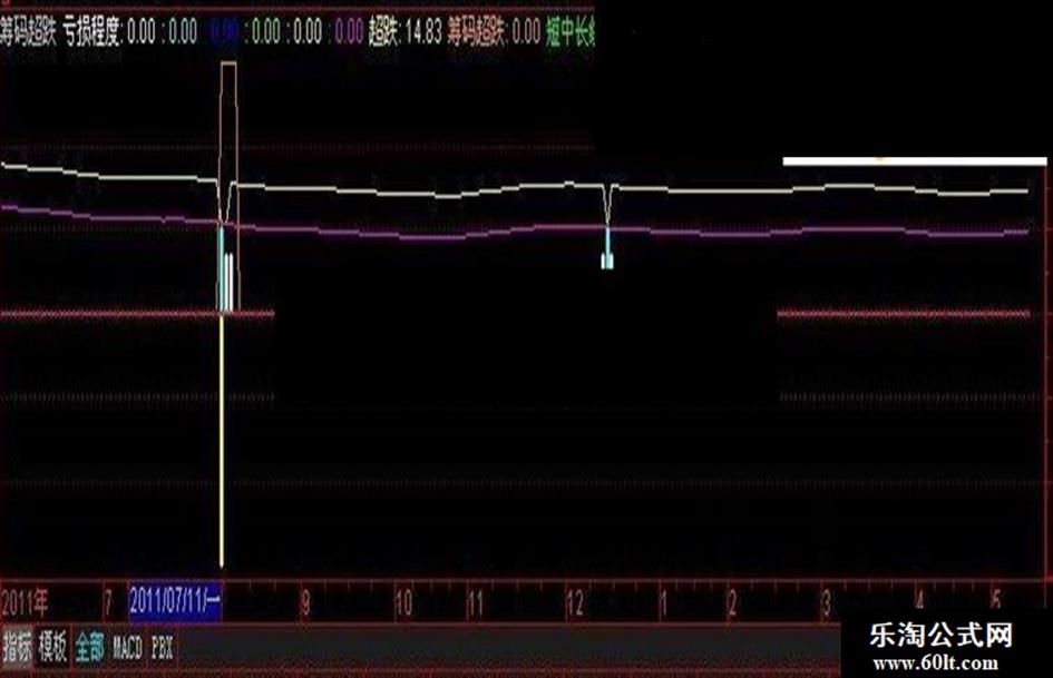 云:IF(超跌=反弹 AND CYS13<=-16 AND 筹码超跌=30 AND 短中长线超跌=40,-20,0),COLORRED,STICK,LINETHICK3;