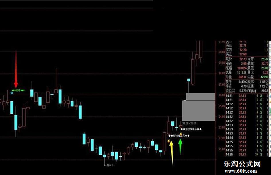 DRAWTEXT(CROSS(RSI,7.1) AND MA(V,5)>MA(V,10),L,'◆◆短线擒黑码◆◆'),COLORWHITE;