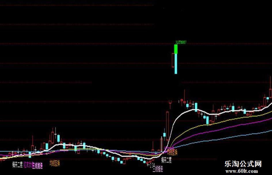 形态特征:股价经过长期下跌或充分调整以后,55日均线基本处于水平状态。股价沿着13日均线爬至55日均线附近进行窄幅整理。在13日均线上穿55日均线之日,如果股价携量上攻,形态即告成立。把站在"右上角"结点处的那根阳线称之为"红衣侠女"。是即将拉升的标志之二。