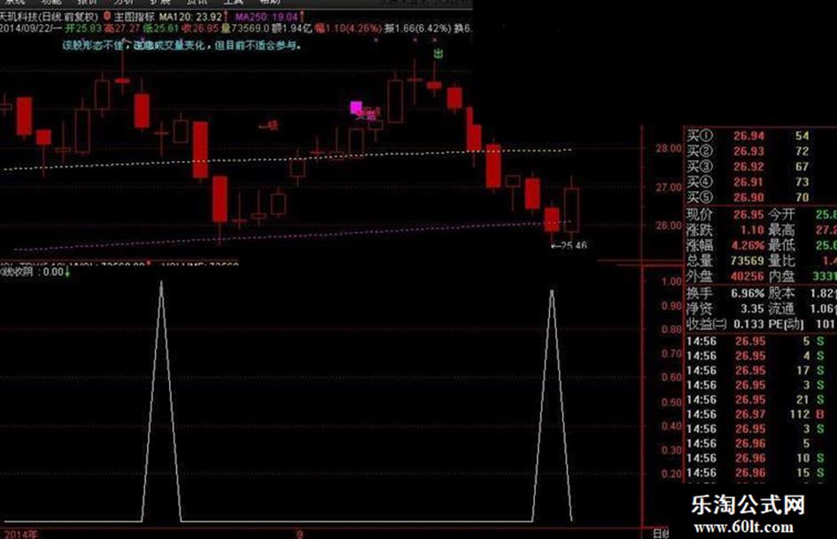 DRAWTEXT_FIX(情况13=1,0.10,0,0,'该股形态不佳,注意成交量变化,但目前不适合参与。'),COLORFFFF00;