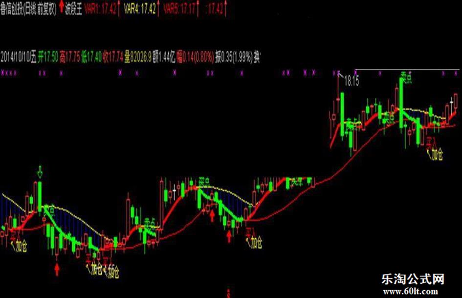 输出买入:1日前的VAR5=1日前的VAR1 AND VAR5波段加仓:AAA赋值:(3*收盘价+最高价+最低价+开盘价)/6