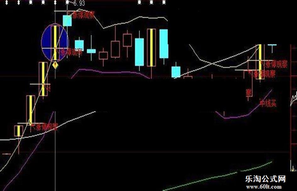 zt:=1.1*REF(C,1)-C<=0.01; STICKLINE(zt=1,C,O,2,0),COLORYELLOW; 涨停观察:SELFDATA('涨停观察'),LINETHICK0; DRAWTEXT(涨停观察>0,涨停观察,'↖涨停观察'),COLORRED; STICKLINE(涨停观察>0,涨停观察,涨停观察,22,0),COLORYELLOW;