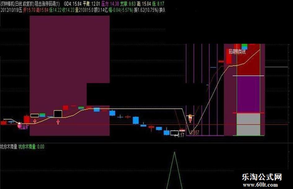 坑爹:=REF(HHV(H,15),1); 坑你:=REF(LLV(L,15),1); 慎用:=REFDATE(坑你,DATE); 坑你木商量:IF(慎用=L AND ((C-L)>(O-C) OR (O-L)>(C-O)),1,0);