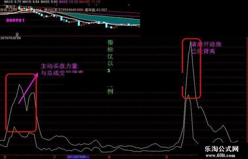 主动买:=IF(O=C AND (C-REF(C,1))/REF(C,1)*100>9.8,AMOUNT,AMOUNT/((H-L)*2-ABS(O-C))*(C-L)); VOL3主:MA(主动买,3)COLORYELLOW; VOL3总:MA(AMOUNT,3),COLORWHITE;