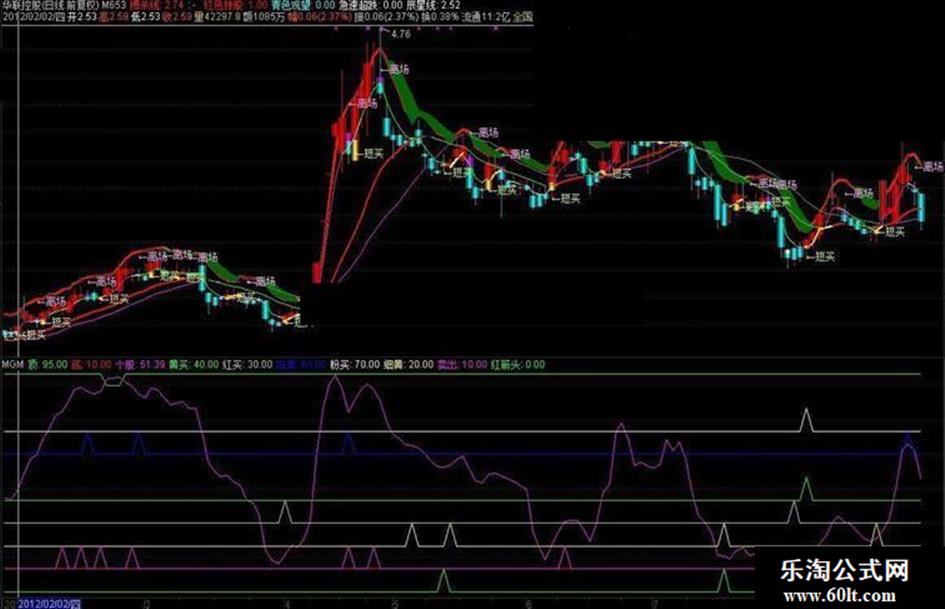 卖出:IF(A1>=70 AND A1>A2 AND V<REF(V,2) AND C<REF(C,1)*1.03,20,10);