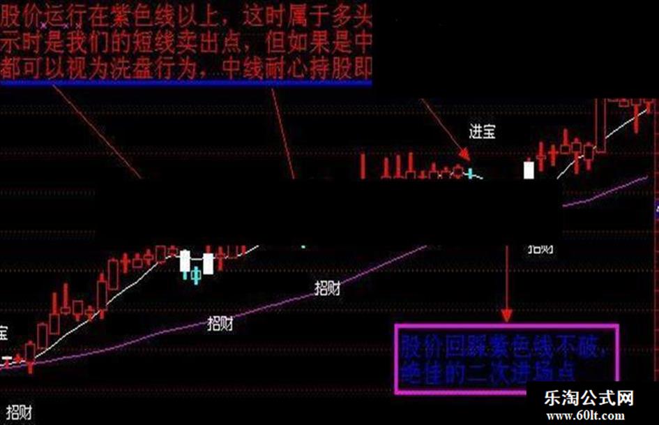 3、当盘面中股价上穿白色线的时候也是我们的短线买入信号之一。当盘面当中出现“招财”提示,同时股价站上紫色线或者白线金叉紫色线,这时是我们最为稳健的中线建仓机会