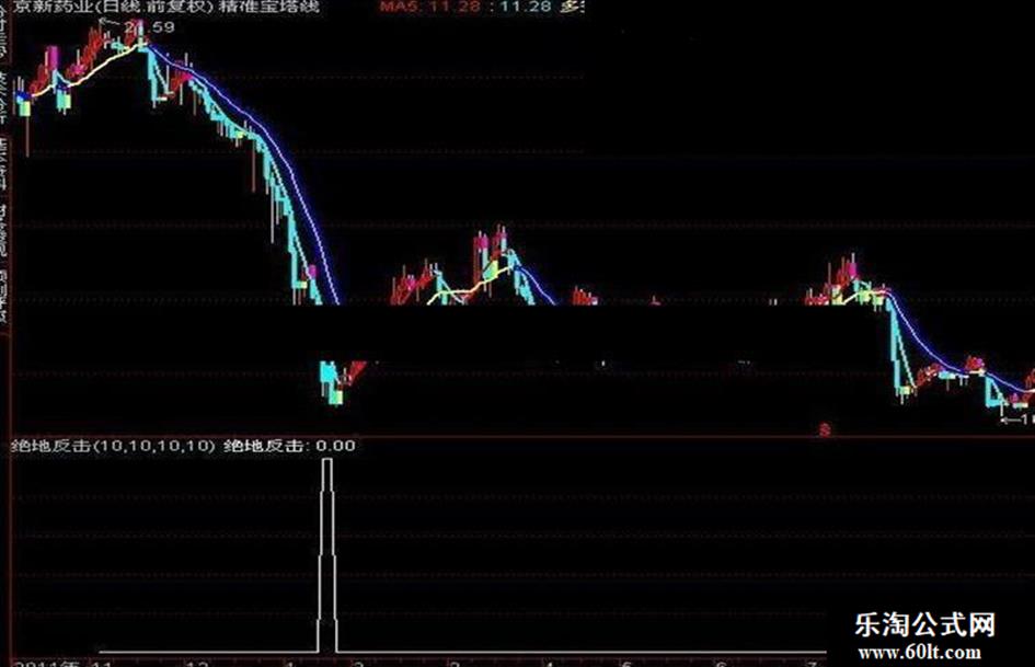 jvar1:=close/ma(close,20)*100<75; jvar2:=close/ma(close,40)*100<70; jvar3:=close/ma(close,60)*100<65; jvar4:=high>low*1.051; jvar5:=jvar4 and count(jvar4,5)>1; 绝地反击:jvar5 and (jvar1 or jvar2 or jvar3),stick3d;