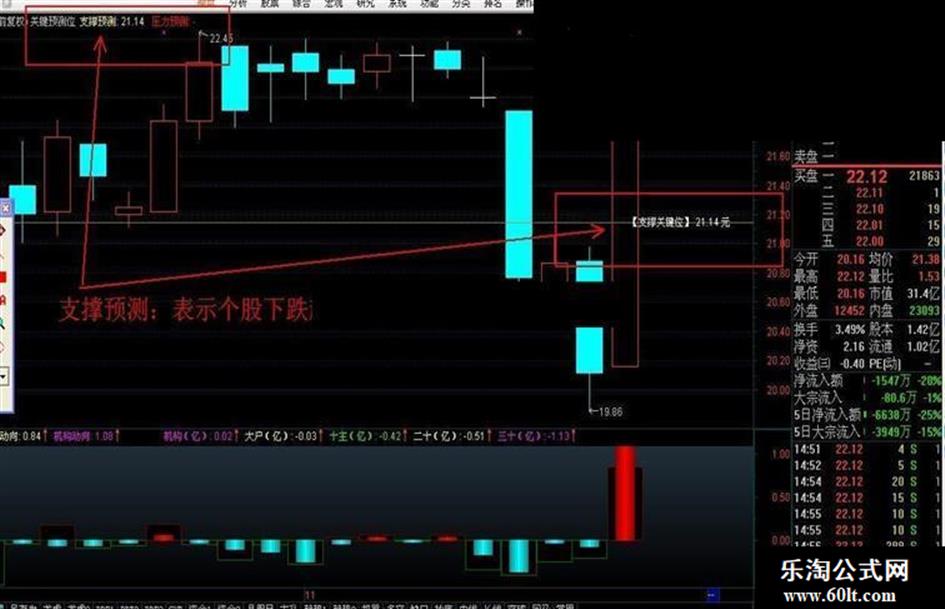 压力预测:IF(买线>卖线,REFDATE(LLV(L,34),DATE)+(REFDATE(HHV(H,34),DATE)-REFDATE(LLV(L,34),DATE))*(1-0.236),DRAWNULL),COLORRED,NODRAW;