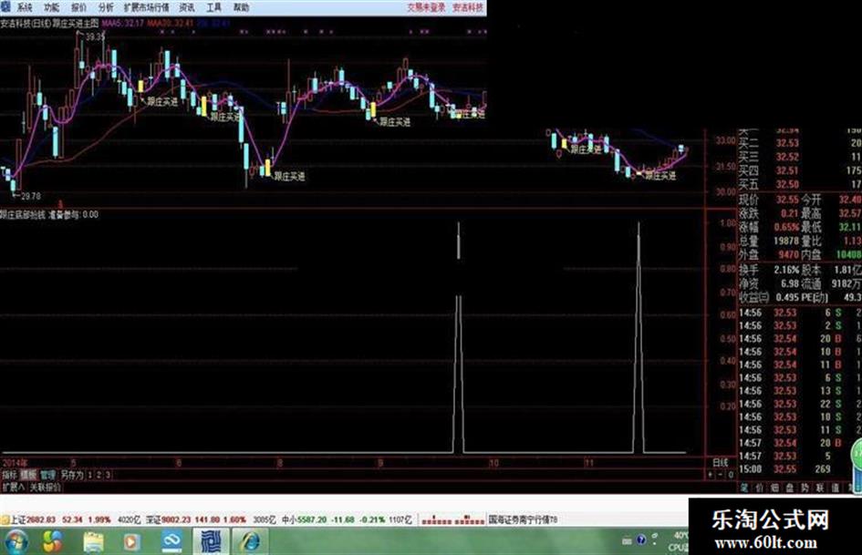 适当买入:= IF(CROSS(趋势线,底部标志),100,0),COLOR0099FF,LINETHICK4;