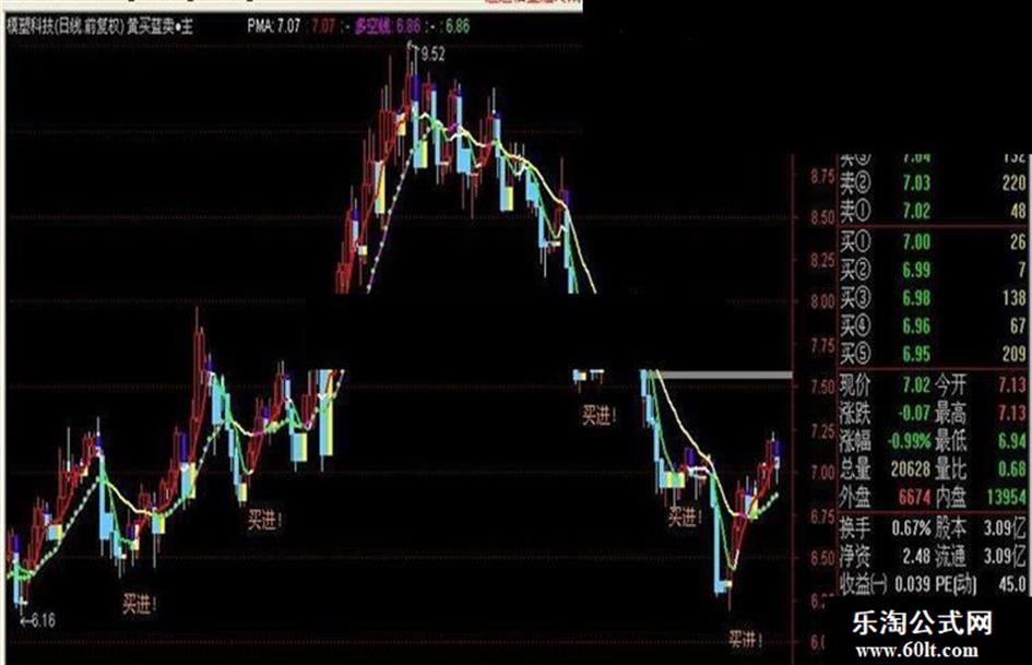 多空线:(20*X+19*REF(X,1)+18*REF(X,2)+17*REF(X,3)+16*REF(X,4)+15*REF(X,5)+14*REF(X,6)