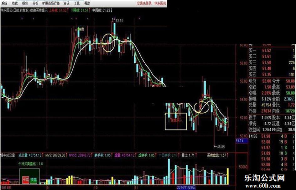 本指标乃从别的地方淘来,用着感觉不错,遂分享给大家。如果你有一套自己的交易模式,又有铁的纪律,赚钱也不是很难的。指标只是辅助工具而已,不可盲目买卖,最重要还是自己大脑,世上没有100%准确指标,博的就是一个高的概率。此指标没有未来函数,下面贴出几幅图片。当出现“注意买入“字样时,你就要注意了,分析此时的位置,相对低位可能就是一波大涨。当然如果是下跌中继,或前期出现过大涨甚至翻倍,请不要盲目买进,否则可能会吃套的。相对低位可以大单买入,出现红色箭头也要注意买入,超短跑得快的盈利没问题,设置好止损位。本指标适合上班族用。