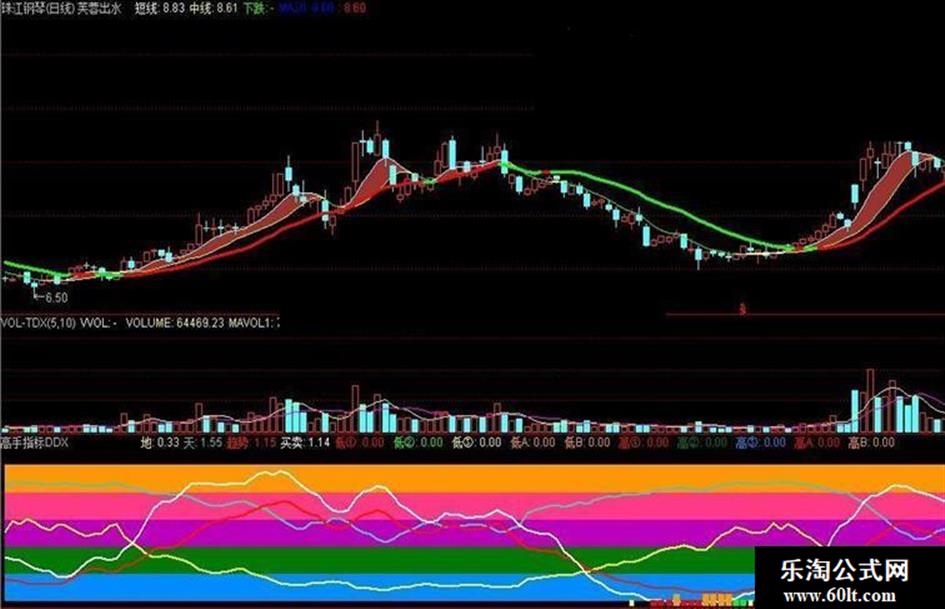 DRAWBAND(0,RGB(0,139,255),0.5,RGB(0,139,255)),COLORFF8B00; DRAWBAND(0.5,RGB(0,120,0),1,RGB(0,120,0)),COLOR007800; DRAWBAND(1,RGB(187,0,187),1.5,RGB(187,0,187)),COLORBB00BB; DRAWBAND(1.5,RGB(255,58,133),2,RGB(255,58,133)),COLOR853AFF; DRAWBAND(2,RGB(255,152,0),2.5,RGB(255,152,0)),COLOR0098FF; DRAWTEXT(ISLASTBAR,0.25,'███'),COLORFF8B00; DRAWTEXT(ISLASTBAR,0.25,'冰冻'),COLORFFFFCC; DRAWTEXT(ISLASTBAR,0.75,'███'),COLOR007800; DRAWTEXT(ISLASTBAR,0.75,'冷门'),COLORWHITE; DRAWTEXT(ISLASTBAR,1.25,'███'),COLORBB00BB; DRAWTEXT(ISLASTBAR,1.25,'活跃'),COLORFFFFCC; DRAWTEXT(ISLASTBAR,1.75,'███'),COLOR853AFF; DRAWTEXT(ISLASTBAR,1.75,'热门'),COLORWHITE; DRAWTEXT(ISLASTBAR,2.25,'███'),COLOR0098FF; DRAWTEXT(ISLASTBAR,2.25,'高温'),COLORWHITE; {计算数据} R:=PERIOD; S:=FROMOPEN;VA1:=EMA(CAPITAL/IF(R=0,SUM(VOL,S),VOL)/CLOSE,10)/CLOSE; 地:IF(VA1>=2.5,2.5,VA1),COLORYELLOW,LINETHICK2; 天: POW(ATAN(EMA(CAPITAL/IF(R=0,SUM(VOL,S),VOL)/CLOSE,10)),2),COLORB5CA43,LINETHICK2; 趋势: EMA(WINNER(CLOSE)*100,10)/50,LINETHICK2,COLOR0015FF; 买卖: EMA((-3)*(HHV(HIGH,30)-CLOSE)/(HHV(HIGH,30)-LLV(LOW,30))+2.7,9),COLORWHITE,LINETHICK2; {低位信号} 低①:买卖<0,COLORRED,NODRAW; STICKLINE(低①,0,-0.1,3,0), COLORRED; 低②:买卖<0.1 AND 买卖>0 AND 买卖>=ref(买卖,1),COLORGREEN,NODRAW; STICKLINE(低②,0,-0.1,2.5,0), COLORGREEN; 低③:买卖<0.25 AND 买卖>0.1 AND 买卖>=ref(买卖,1),COLORYELLOW,NODRAW; STICKLINE(低③,0,-0.1,2,0), COLORYELLOW; 低A:买卖<0 AND 买卖>=ref(买卖,1),COLOR0099FF,NODRAW; STICKLINE(低A,0.1,-0.1,3,0), COLOR0099FF; 低B:买卖<ref(HHV(买卖,5),4) AND 买卖>=ref(买卖,1) AND 买卖<0.8 AND 趋势>=ref(趋势,1) AND ref(EXIST(买卖<=ref(买卖,1),2),1) AND ref(EXIST(买卖<=0,10),8),COLOR0099FF,NODRAW; STICKLINE(低B,0.3,0,3,0), COLOR0099FF; {高位信号} 高①:买卖>2.5 AND 买卖>ref(买卖,1),COLORRED,NODRAW; STICKLINE(高①,2.6,2.4,3,0),COLORRED; 高②:天>=1.9 AND 买卖>=2.2 AND CROSS(ref(HHV(买卖,3),3),天),COLOR007800,NODRAW; STICKLINE(高②,2.6,2.4,2.5,0),COLOR007800; 高③:天<1.77 AND 买卖>=2.2 AND CROSS(ref(HHV(买卖,7),6),天),COLORFF8B00,NODRAW; STICKLINE(高③,2.6,2.4,2,0),COLORFF8B00; 高A:买卖>2.45 AND 买卖<2.5 AND 买卖<=ref(买卖,1), COLORRED,NODRAW; STICKLINE(高A,2.5,2.4,3,0), COLORRED; 高B:买卖>ref(LLV(买卖,5),4) AND 买卖<=ref(买卖,1) AND 买卖>1.5 AND 趋势<=ref(趋势,1) AND ref(EXIST(买卖>=ref(买卖,1),2),1) AND ref(EXIST(买卖>=2.48,10),8), COLOR0099FF,NODRAW; STICKLINE(高B,2.7,2.4,3,0), COLOR0099FF;