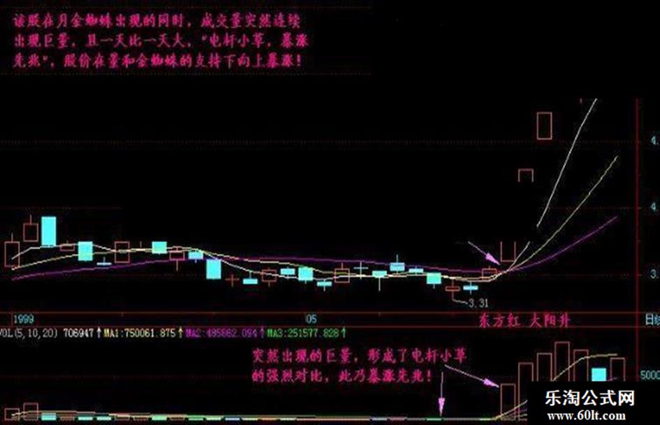 金蜘蛛这种图形因为均线成本发生了共振,所以对股价的支撑力比价托要更好一些,金蜘蛛一旦得到了成交量的支持,往往有上扬行情!所以发现金蜘蛛的同时如果能发现提前形成的量托,那么在金蜘蛛上的股价缩量反压均线系统时是低吸的好机会,股价一旦放量突破金蜘蛛上平台更应该买进。