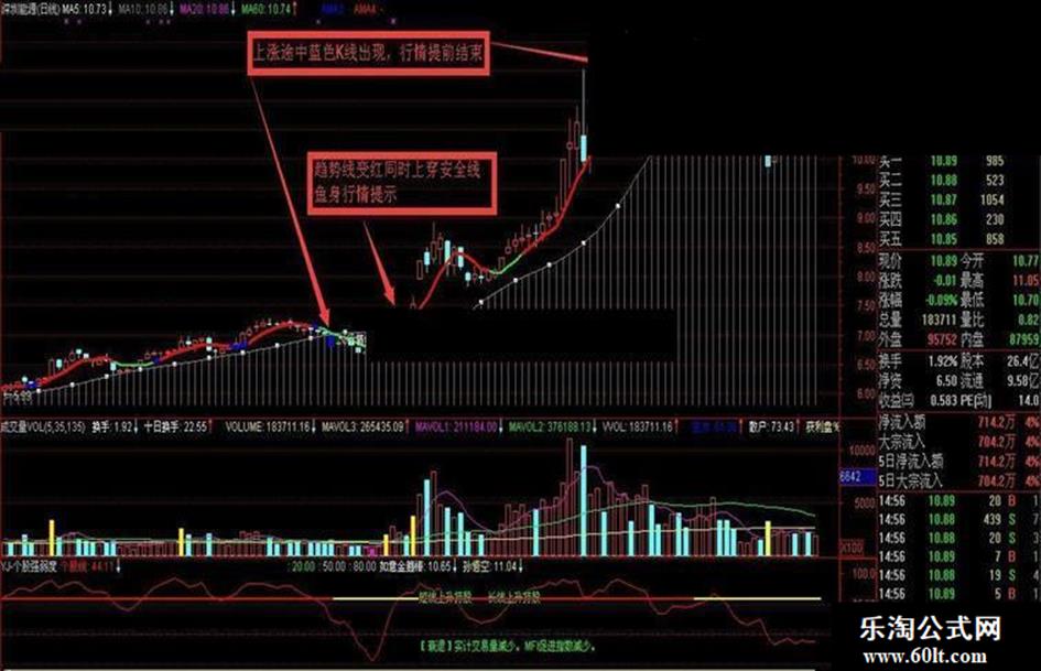 可能有人会问,什么是鱼身行情?其实这就好比大多数人在吃鱼的时候会选择肉最多、刺最少的鱼身一样,所谓的鱼身行情往往就是一波行情中获利相对容易的主升幅阶段。为了不使很多散户股民被鱼刺卡住,特推出这鱼身行情指标,公式中提示不是在最低位买,也不是在最高位卖,只吃上涨最肥的中间一段。当趋势线变红并上穿安全线,这时K线变黄,这是最好的鱼身出现,介入是没错的。当K线变蓝是提前一天提示卖出,第二天趋势下穿安全线这时鱼身行情已经进入尾声了,后面即使还有机会向上,也不必理会,要小心只是鱼刺行情,如果在不知不觉中被鱼刺卡住,将会十分难受。