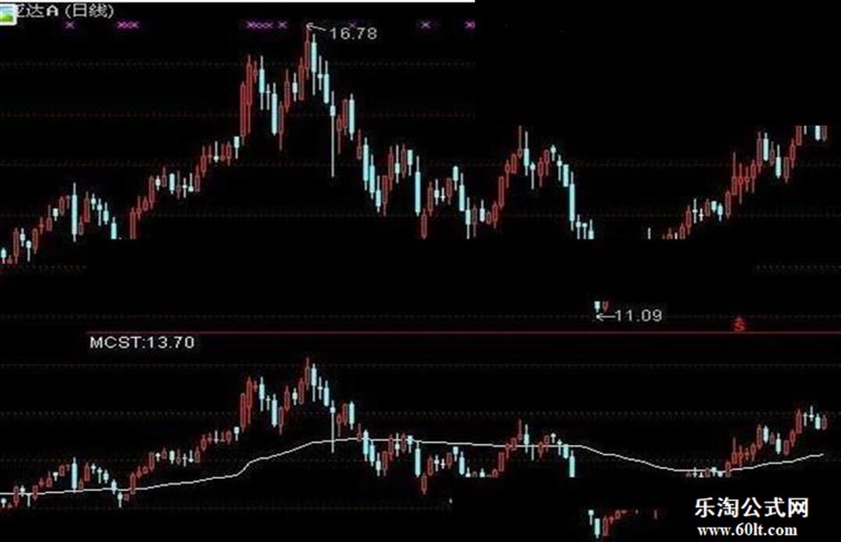 使用说明:当股价在MCST曲线下方翻红时应关注,若向上突破MCST曲线应买入。当MCST曲线的下降趋势持续超过30日时,若股价在MCST曲线上方翻红应买入。