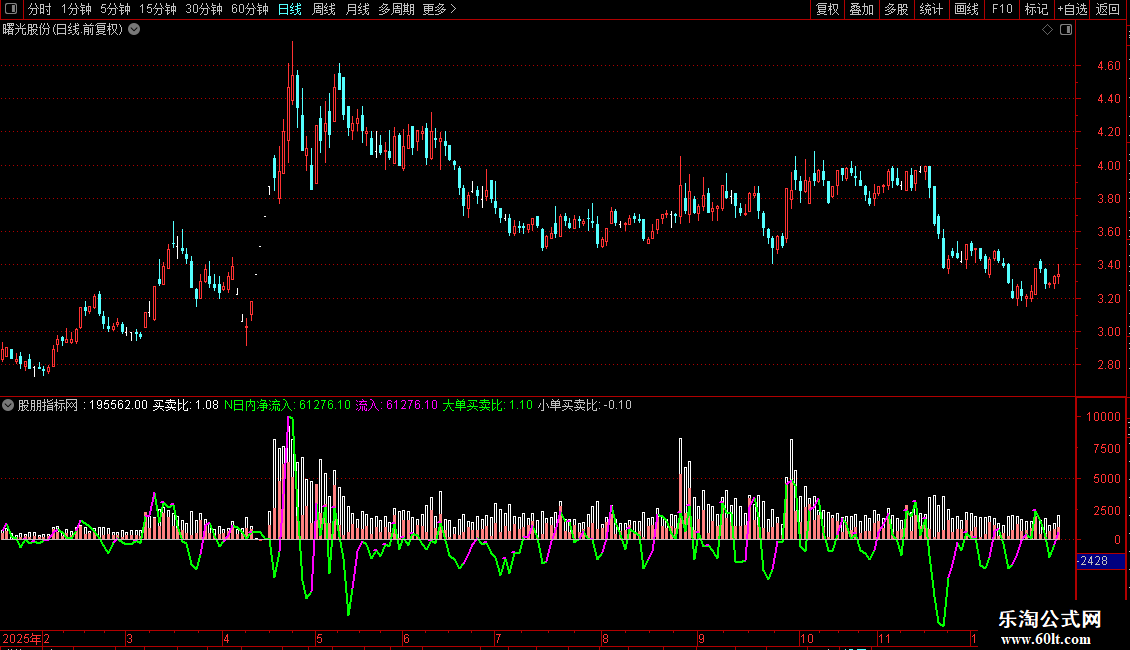 卖:=IF(CLOSE>OPEN,0-VAR1*((HIGH-CLOSE)+(OPEN-LOW)),IF(CLOSE<OPEN,0-VAR1*(HIGH-LOW),0-VOL/2)),COLOR00FF00 ;