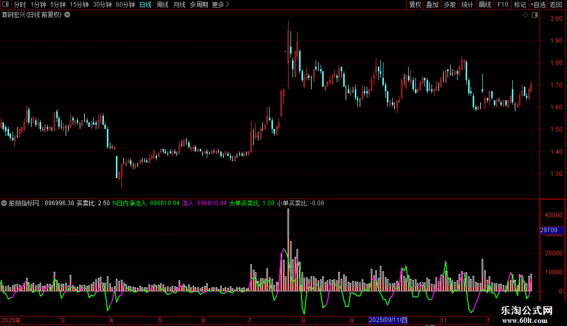 买:=IF(CLOSE>OPEN,VAR1*(HIGH-LOW),IF(CLOSE<OPEN,VAR1*((HIGH-OPEN)+(CLOSE-LOW)),VOL/2)),COLORRED;