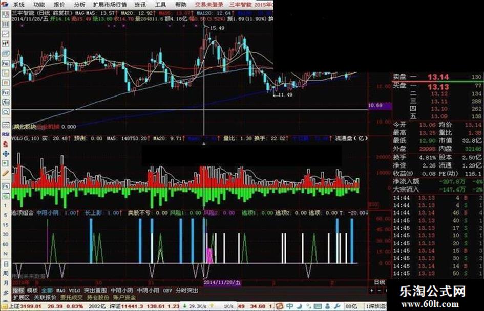 卖股不亏:IF(MA(H,13)<L*0.9,-20,0),STICK,COLORYELLOW;